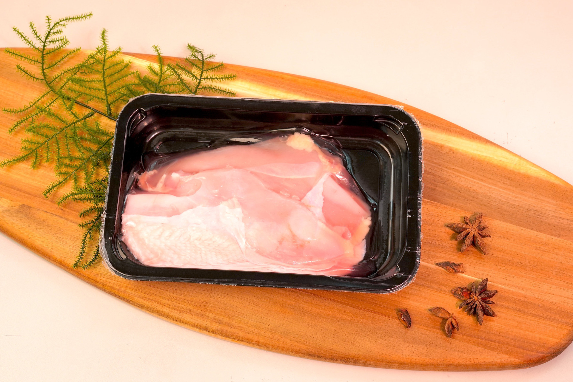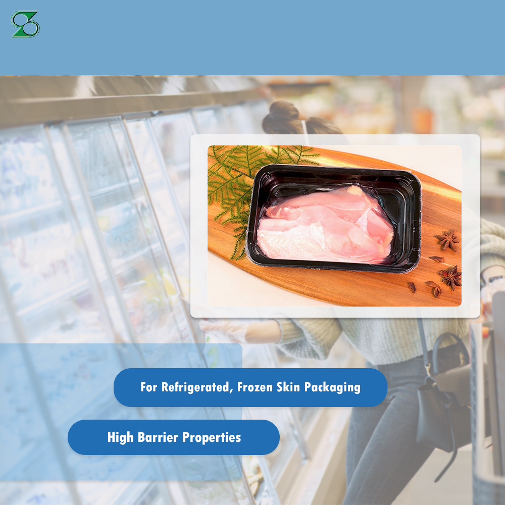 貼體包裝(Skin Packaging)是在產品的上方覆蓋一層猶如皮膚的包裝薄膜與盤子緊密結合 。NY的強韌性不易破包、EVOH的氧氣阻隔性,可維持內容物的新鮮品質。